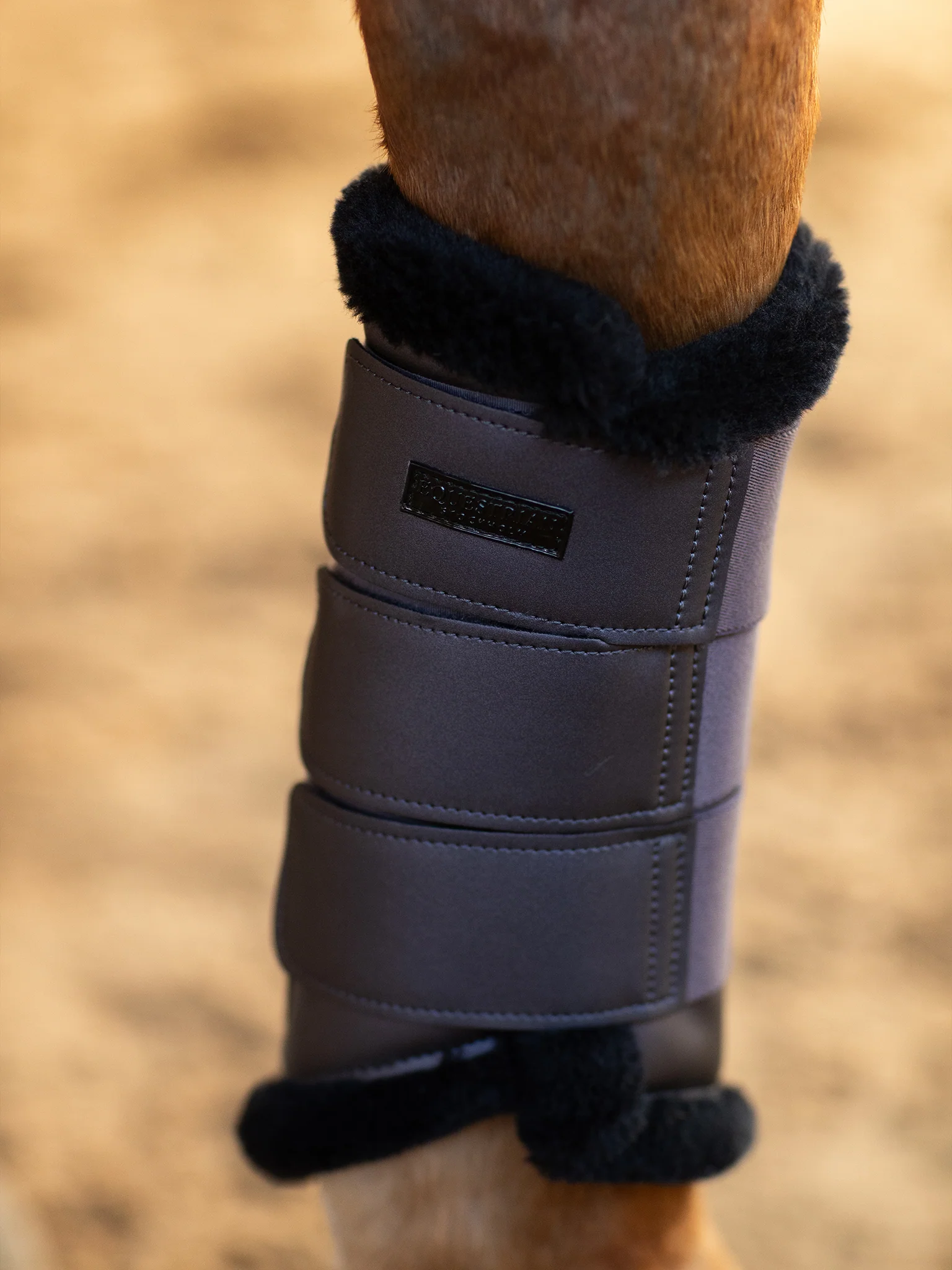 Fabricados en cuero sintético PU de alta calidad con un acabado mate, destacan por su resistencia y facilidad de mantenimiento. Su interior de borreguillo tipo teddy proporciona una excelente amortiguación y evita rozaduras, cuidando al máximo las patas del caballo.