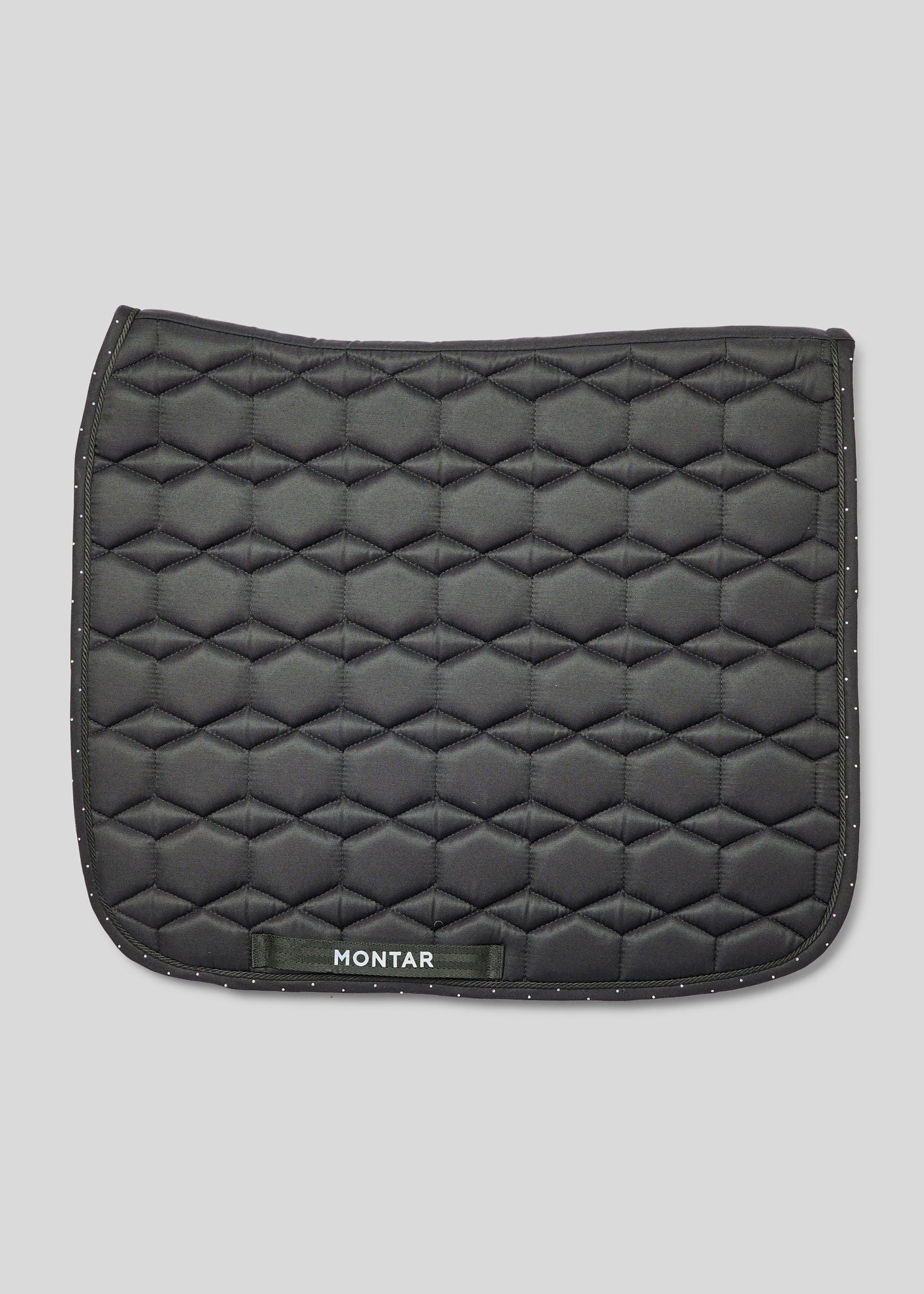 Mantilla de doma negra con logotipo holográfico y cristales. Elegante y funcional, proporciona comodidad y soporte bajo la silla. Ideal para entrenamiento y competición.