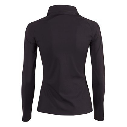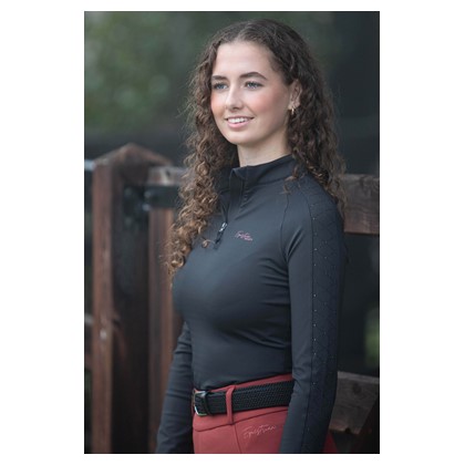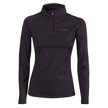 Su diseño destaca por el cuello alto con cremallera corta, las costuras decorativas con cristales a lo largo de las mangas y el logo Equestrian Society en el pecho, que aportan un toque sofisticado y femenino.